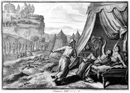 When Phinehas ... saw it, he rose up from among the congregation, and took a javelin in his hand; And he went after the man of Israel into the tent, and thrust both of them through, the man of Israel, and the woman through her belly. 25:7-8a